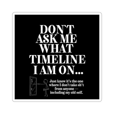 Our funny stickers featuring the quote “Don’t Ask Me What Timeline I’m On” delivers cosmic sass and metaphysical truth in one unforgettable line. Stick it where it counts — laptops, water bottles, journals, phone cases, mirrors, or your ex’s dreams.